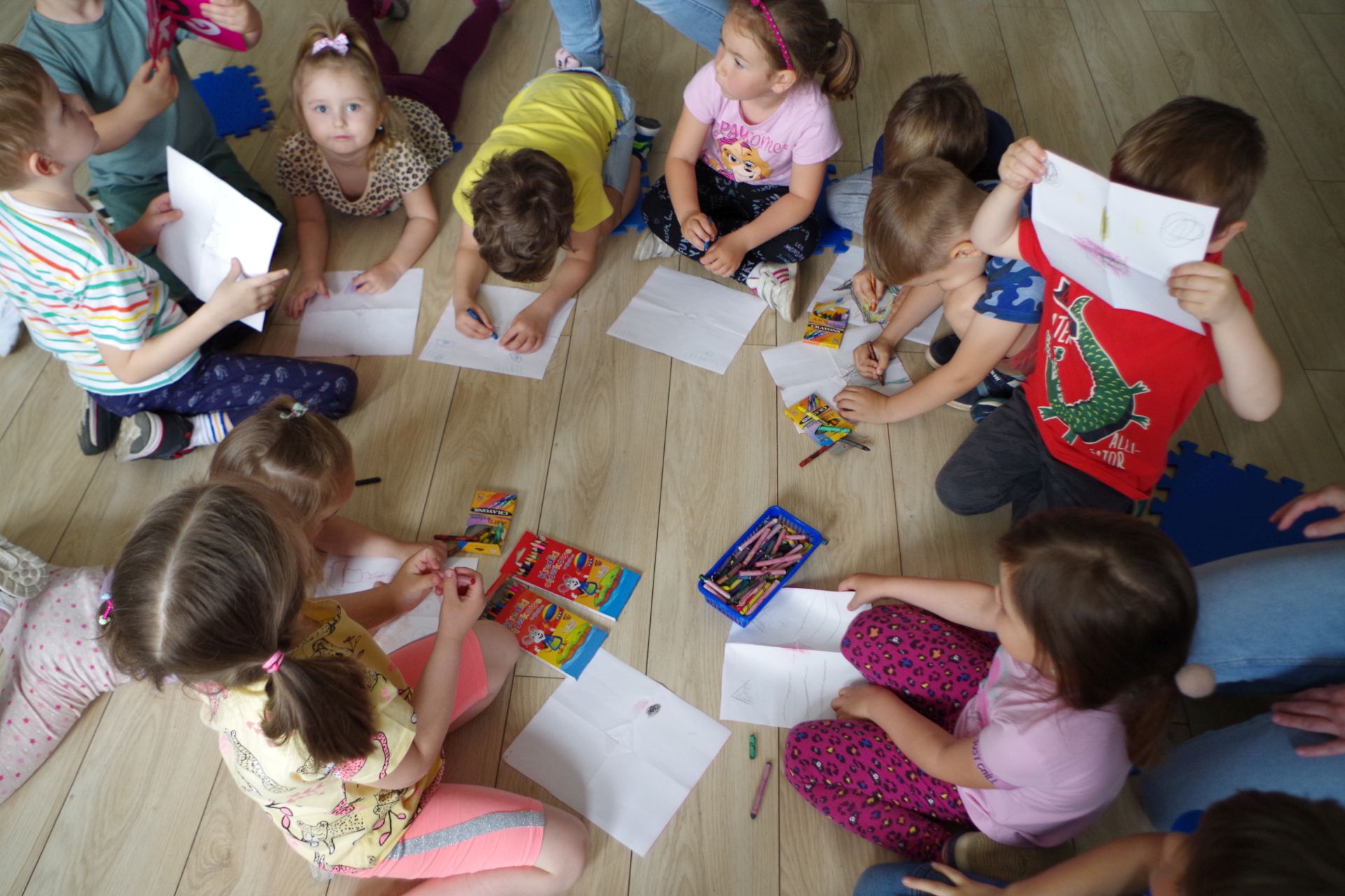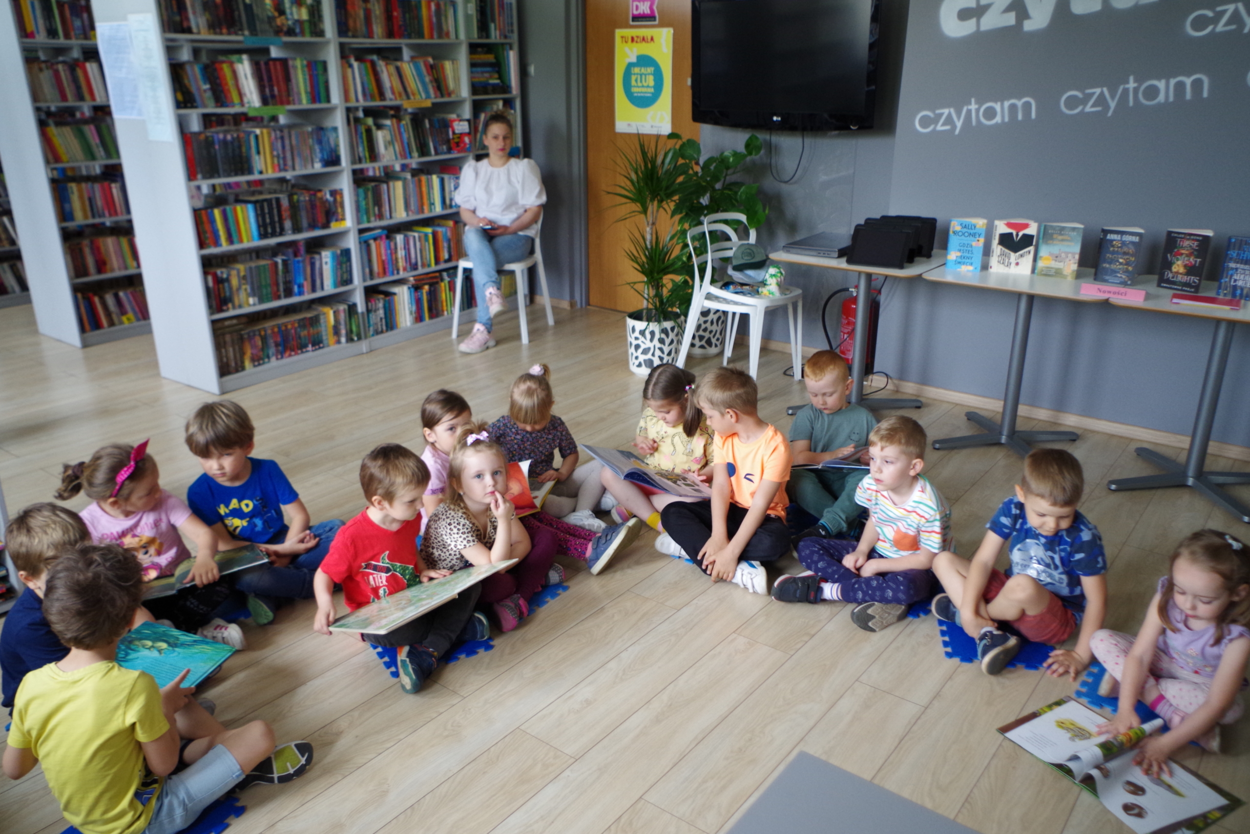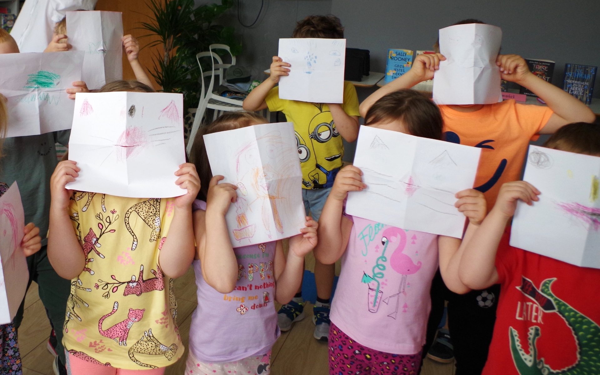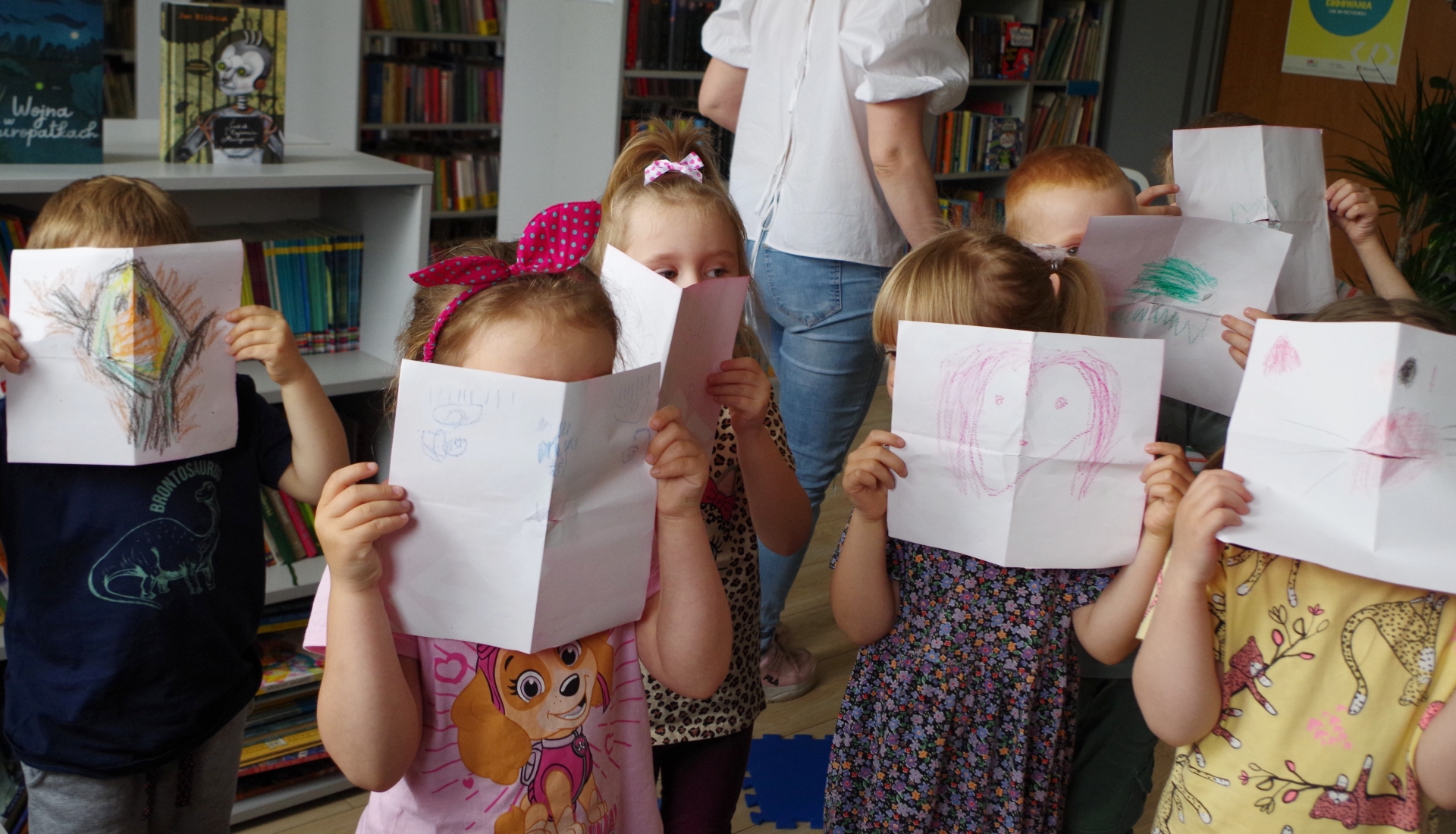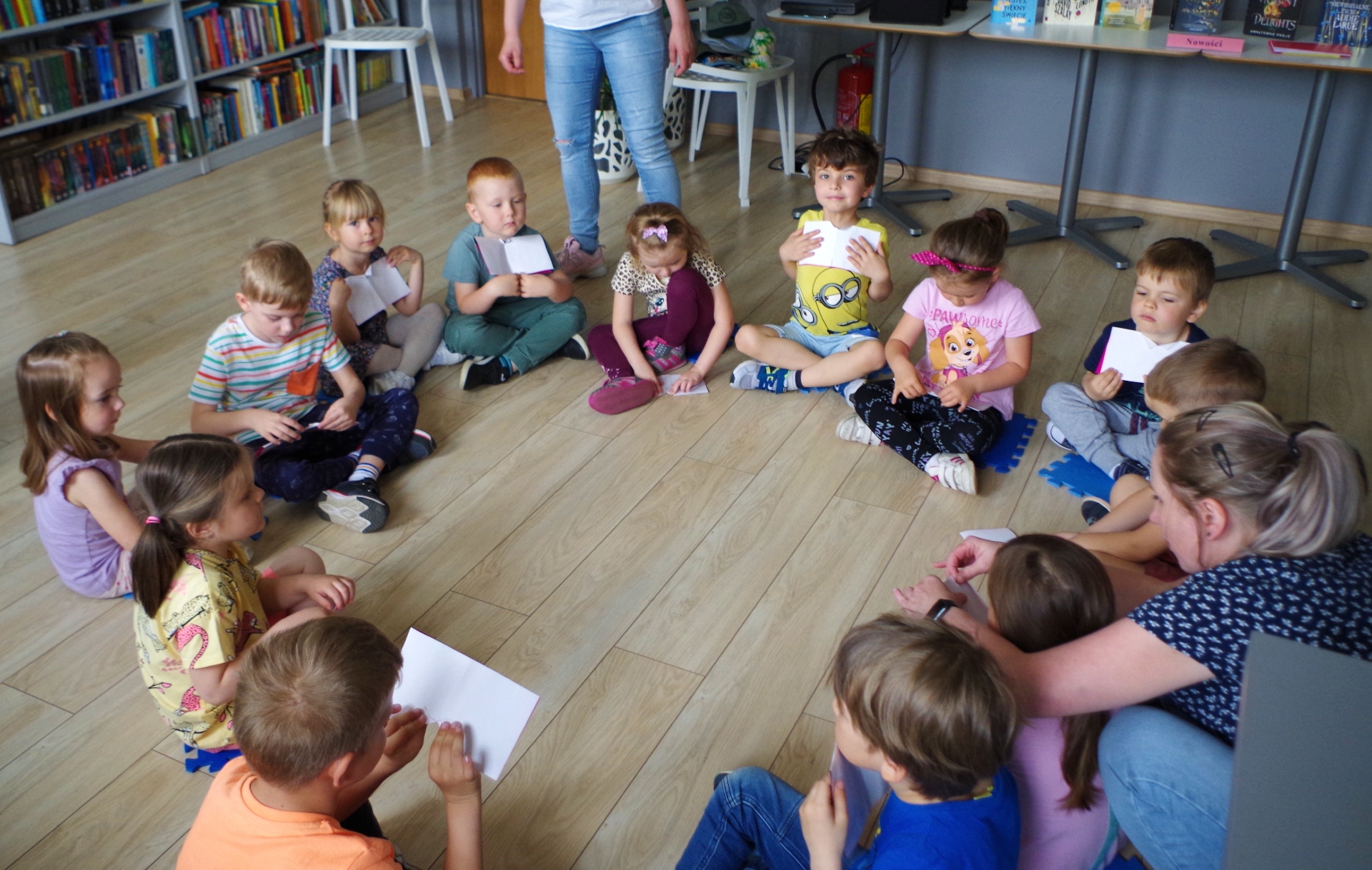 Zabawa była przednia, a podczas niej zauważyliśmy też, że księżniczka Dalia była uczulona na złoto. Porozmawialiśmy więc o tym, czym jest alergia i dlaczego niektórzy muszą unikać różnych pokarmów i kichają, spędzając czas na wiosennej, zielonej polance. Na zakończenie spotkania grupa 1 wraz z jej opiekunkami sprawiła bibliotekarzowi fantastyczną niespodziankę, wręczając mu laurkę z samodzielnie wykonanymi, bajkowymi ilustracjami.