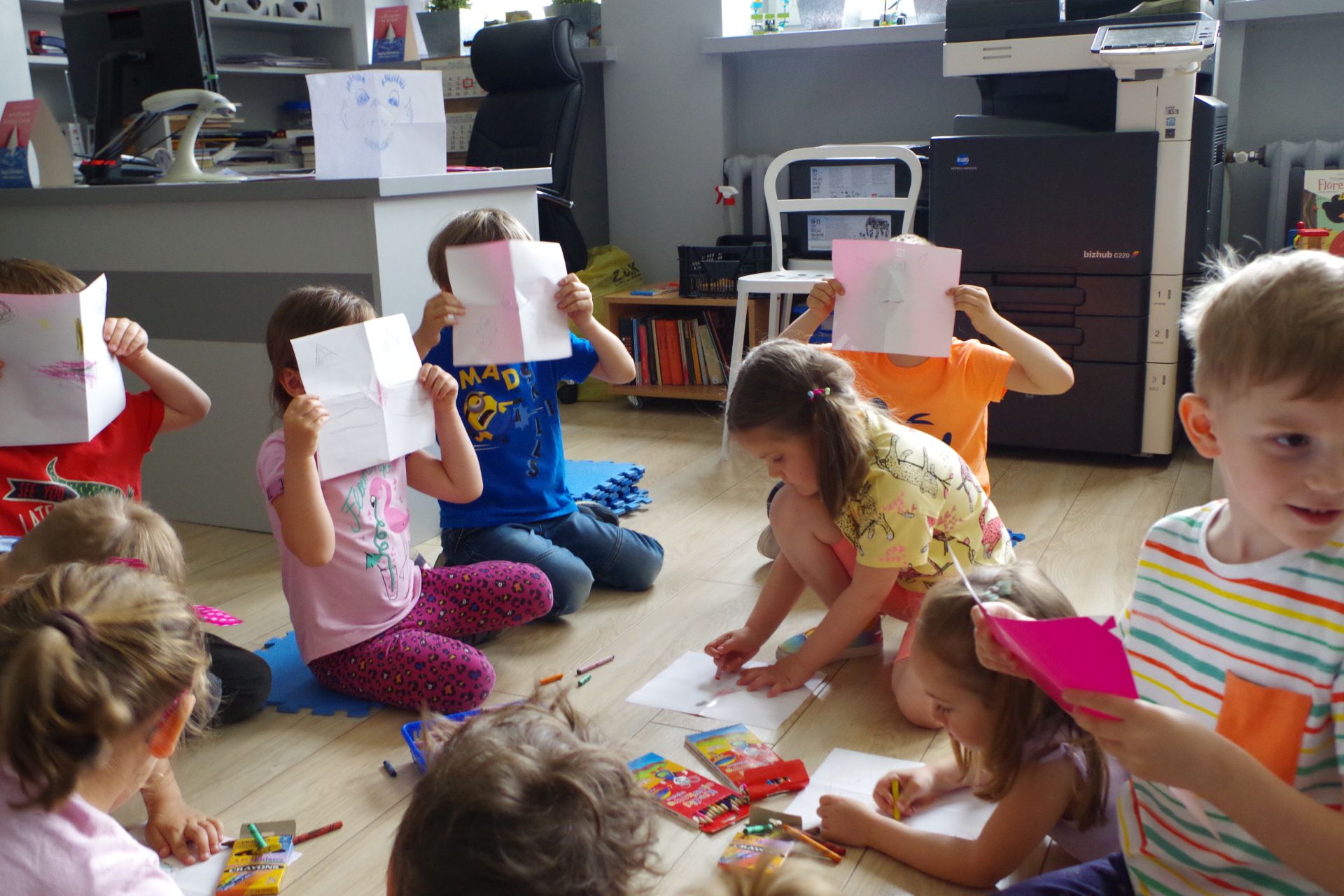 Do takiej krainy wkraczaliśmy z przedszkolakami z grupy 1 podczas spotkania DKK w bibliotece w piątek, 13 maja. Dzieci poznały wówczas bajkę o księżniczce Dalii, która dzięki swej wyobraźni, masce zrobionej z liścia i pewnej niezwykłej smoczycy świetnie się bawiła, udając smoka. Historyjka ta była dla przedszkolaków inspiracją do własnej twórczej zabawy. Składając kartki i używając kredek, dzieci wykonały proste, poruszające ustami maski, które pozwoliły im zamieniać się w wymarzone postacie.