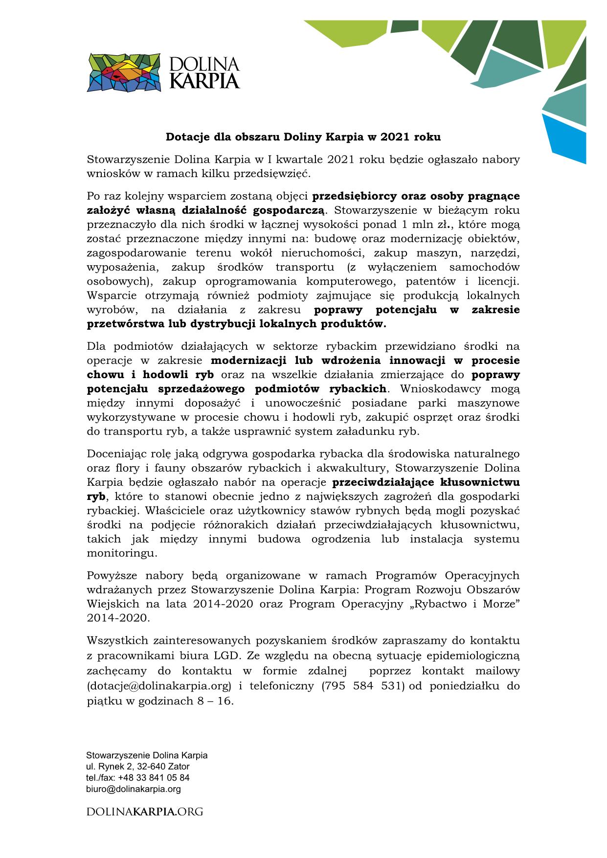 Dotacje dla obszaru Doliny Karpia w 2021 roku 25 stycznia 2021|Aktualności| Podobne wpisy Turniej deblowy tenisa ziemnego o Puchar Doliny Karpia 17 kwietnia 2026 Konkurs fotograficzny “WIOSNA W DOLINIE KARPIA” 17 kwietnia 2026 XIII Powiatowy Przegląd Orkiestr Dętych o Puchar Wójta Gminy Polanka Wielka 13 kwietnia 2026 Zgłoś swoją atrakcję do udziału w XV Targach Turystycznych Doliny Karpia – 28 czerwca 2026 r. 9 kwietnia 2026 Nie pompujesz – Nie Jedziesz!!! Ruszają zapisy na sezon 2026! 2 kwietnia 2026 Ogłoszenia o naborze wniosków z Europejskiego Funduszu Rozwoju Regionalnego 25 marca 2026