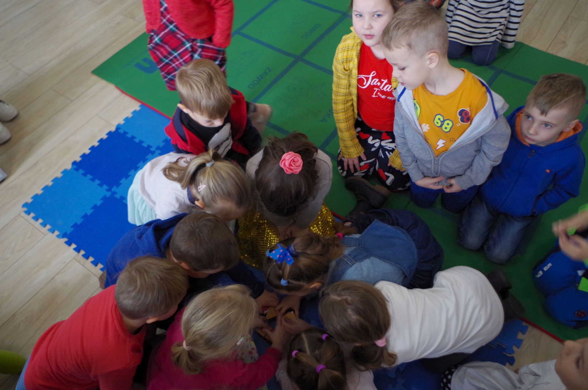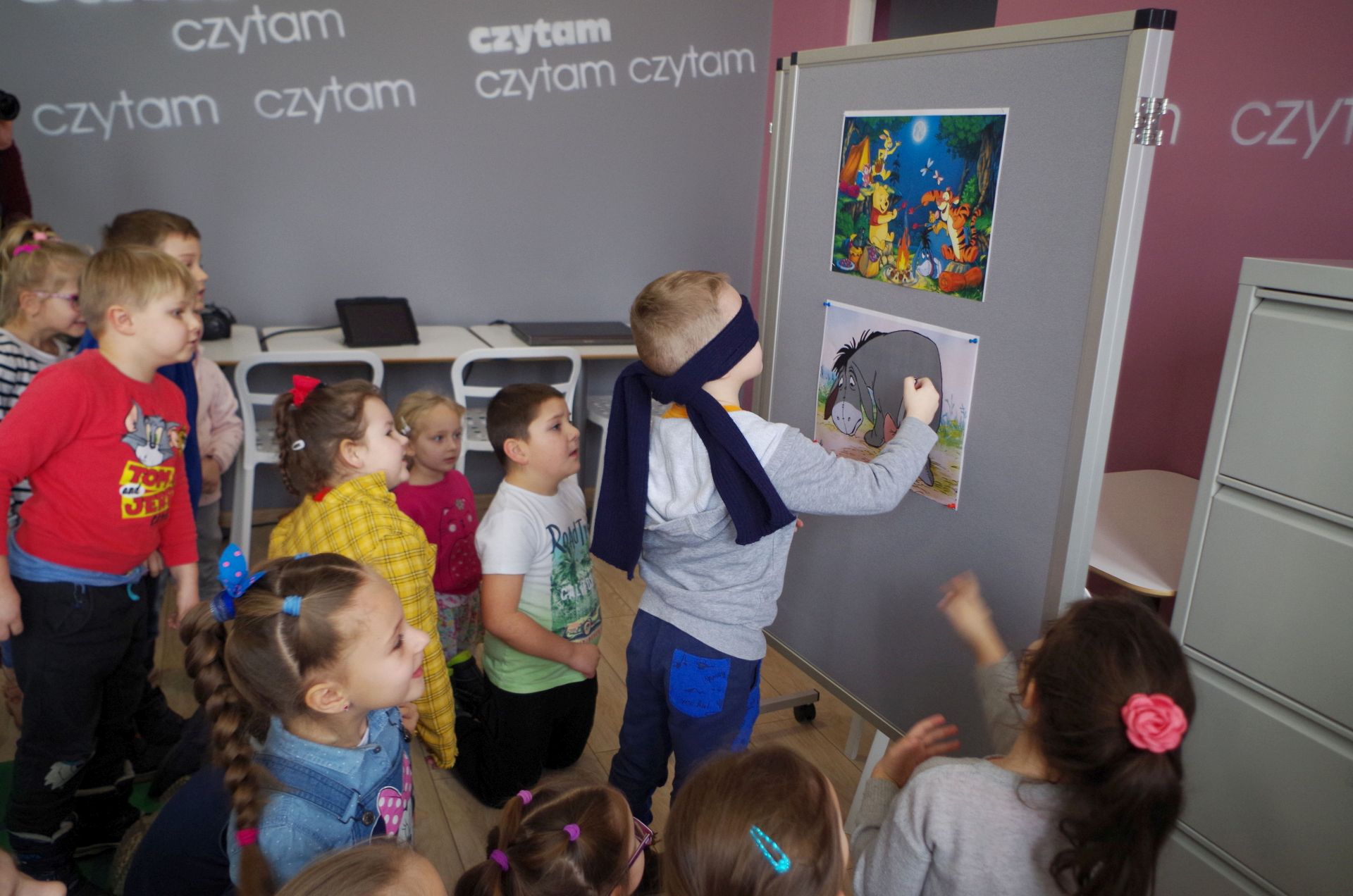 Najpierw dzieci wysłuchały opowieści o Tygrysie, któremu przyjaciele pomagali zejść z wysokiego drzewa. Potem były zabawy, podczas których naśladowaliśmy postacie zamieszkujące Stumilowy Las oraz rozwiązywaliśmy zagadki na ich temat. Odgadując je, niektórzy z naszych małych wielbicieli Puchatka dowiadywali się m.in., kim jest pszczelarz oraz o tym, że nasz puchaty bohater w wersji angielskiej nosił dziewczęce imię – Winnie-the-Pooh (w języku polskim imię Kubuś Puchatek wymyśliła niezapomniana tłumaczka – Irena Tuwim). Następnie zaś ochotnicy mieli za zadanie ułożyć postać Prosiaczka z klocków oraz z zasłoniętymi oczami, słuchając podpowiedzi innych dzieci, przypiąć Kłapouchemu ogon, który zdarzało mu się gubić. Ostatnia z zabaw bardzo się spodobała i każdy chciał pomóc Kłapouchemu odzyskać ogonek.