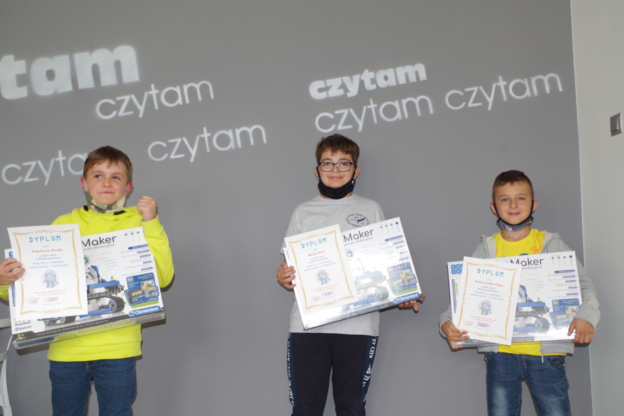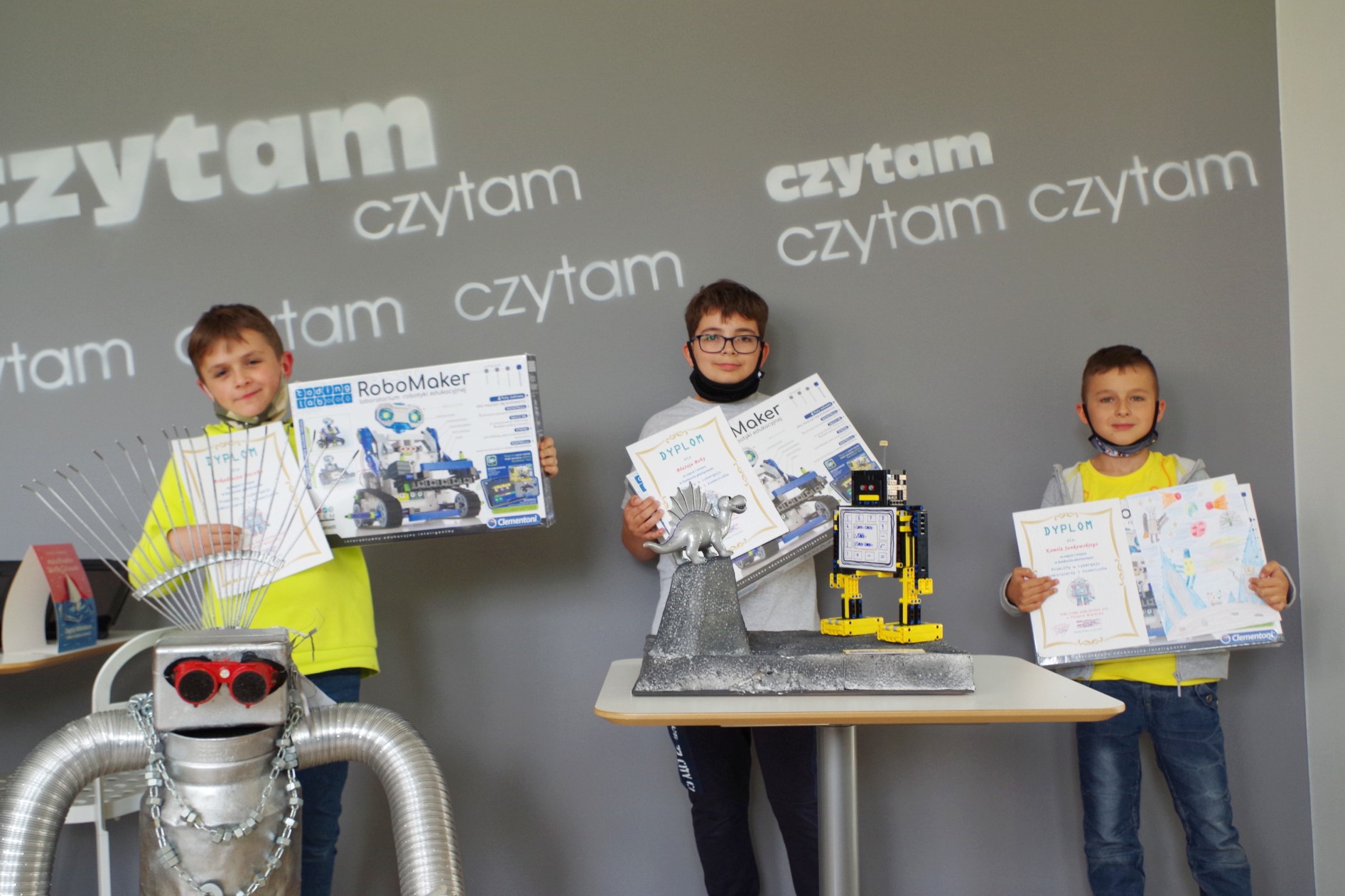 elektrycerzy i kosmoludów” zorganizowanego z okazji Roku Stanisława Lema. Komisja konkursowa w składzie: Sylwia Kawczak, Katarzyna Filip, Michał Lisowski zdecydowała przyznać nagrody za trzy równorzędne I miejsca Błażejowi Bobie, Arkadiuszowi Boczkowi i Kamilowi Jankowskiemu. Zwycięzcy otrzymali edukacyjne zestawy RoboMaker pozwalające odkrywać sekrety robotyki i kodowania. Gratulujemy!