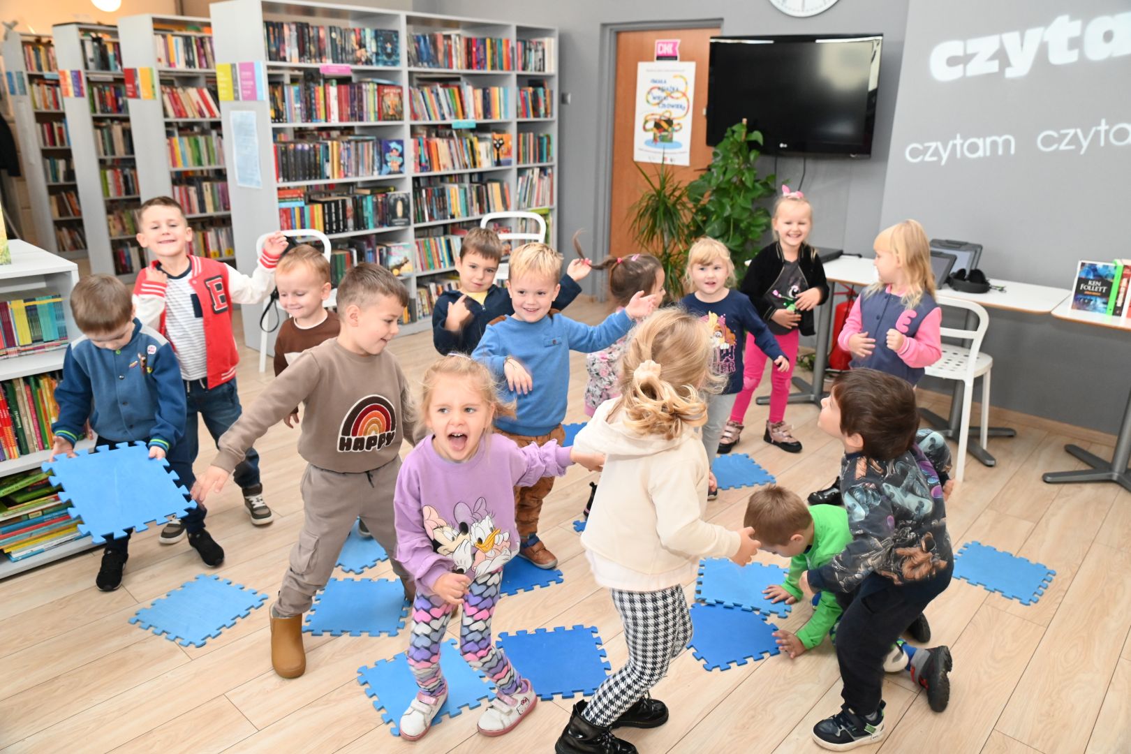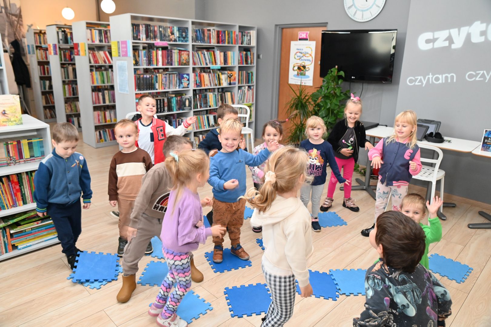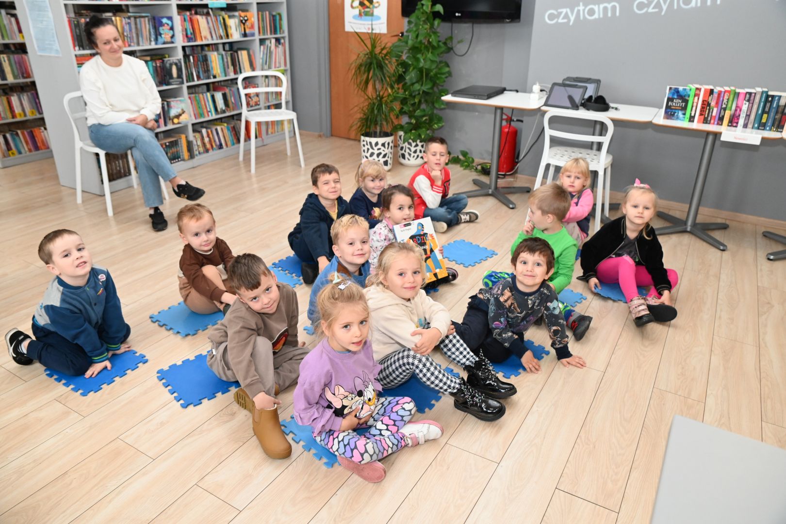 Po lekturze rozmawialiśmy nieco o uczuciach. Najpierw o tych mniej przyjemnych, jak smutek, złość, frustracja (poznawaliśmy takie słowo :)), a potem pozytywnych, w czym pomogła nam „Książka, która nie chciała być czytana” Davida Sundina. Podczas jej czytania było mnóstwo emocji i radosnej zabawy, bo książka czasem fruwała, zamykała się, parzyła, a nawet zmieniała słowa na takie, które wywoływały salwy śmiechu. Czytając ją, m.in. naśladowaliśmy śpiewającą krowę czy królika grającego na banjo :).