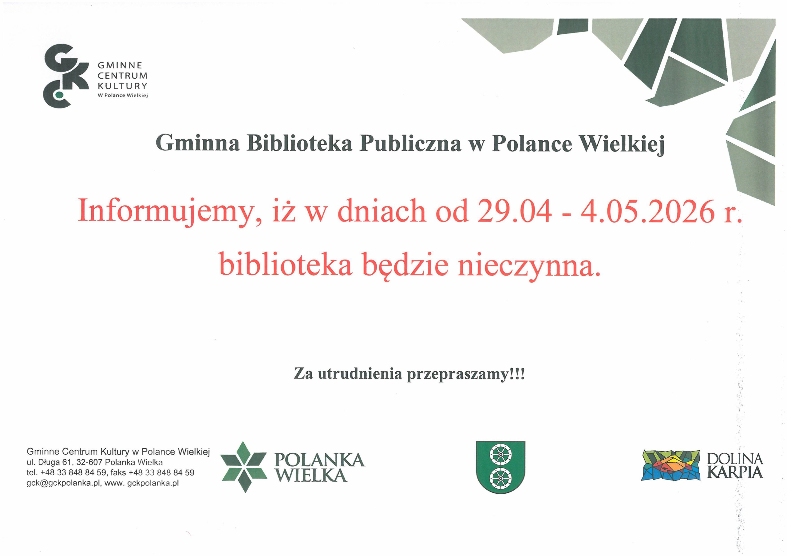 Informujemy, iż w dniach od 29.04 – 4.05 2026 r. biblioteka będzie nieczynna. Za utrudnienia przepraszamy!