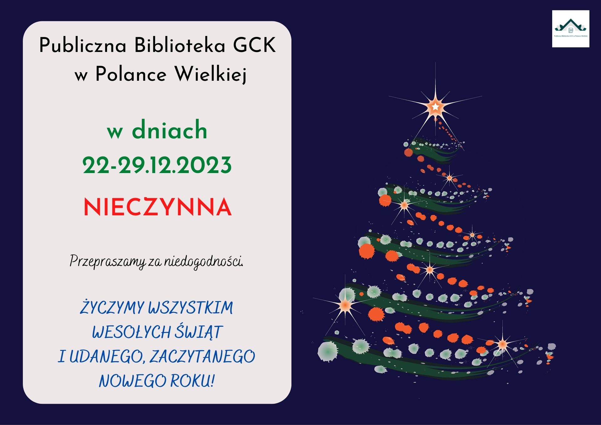 W dn. 22-29.12 biblioteka nieczynna 12 grudnia 2023|Biblioteka| Podobne wpisy KOMUNIKAT!!! Brak wolnych miejsc na zajęcia feryjne dla dzieci!!! 15 stycznia 2026 Ferie zimowe z biblioteką. Dziś ruszyły zapisy, nie zwlekaj, zapisz swoje dziecko już dziś. Liczba miejsc jest ograniczona. 14 stycznia 2026 Informacja 7 stycznia 2026 “Przygoda na świątecznym drzewku” – bajki na Boże Narodzenie! 17 grudnia 2025 “Nie, nie chcę się zapisać do Klubu Książki” powieść Virginii Ironside lekturą w Dyskusyjnym Klubie Książki! 17 grudnia 2025 29-30 grudnia 2025r. zmiana godzin otwarcia biblioteki!!! 12 grudnia 2025