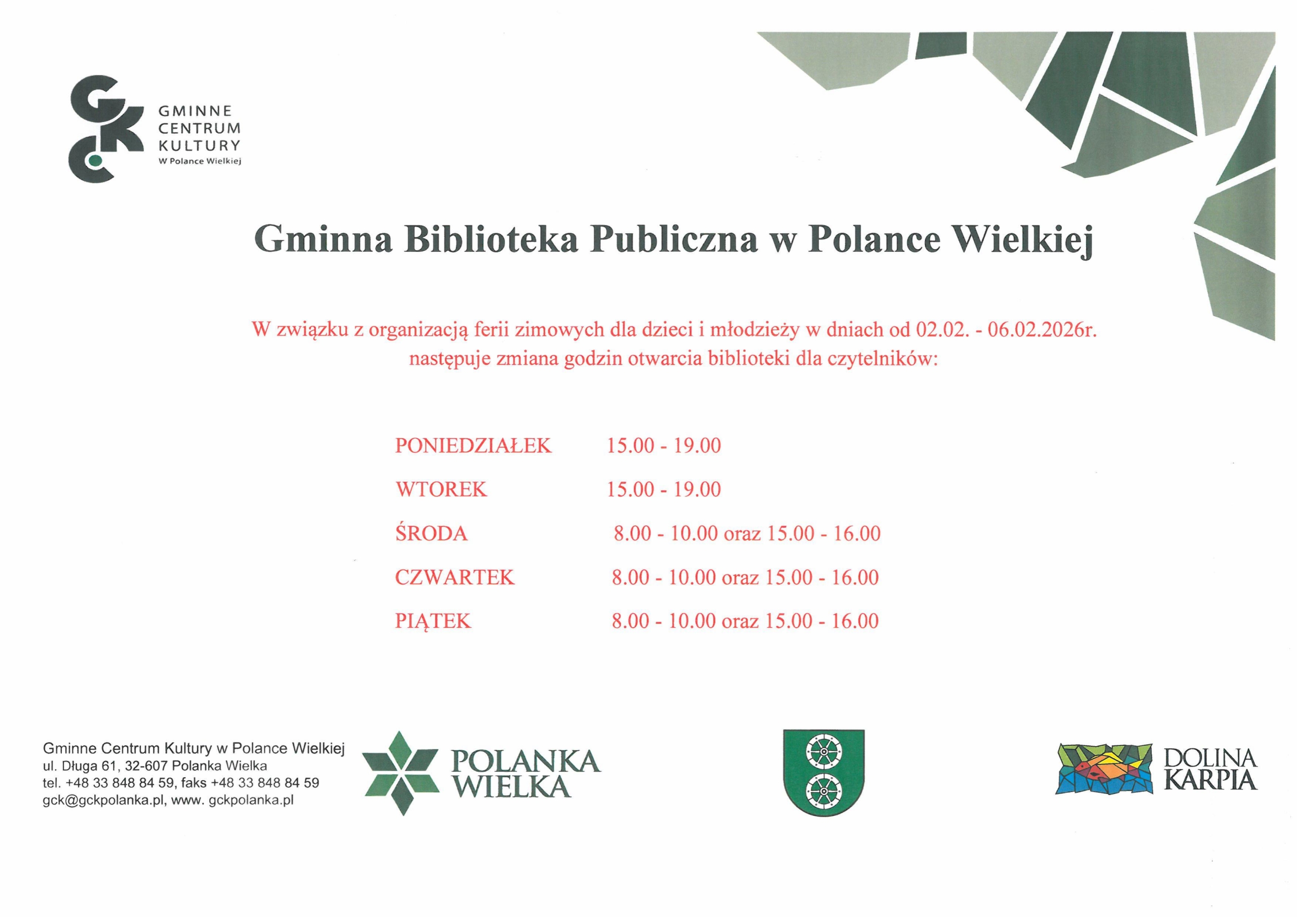 W dniach od 02.02. – 06.02. 2026r. zmiana godzin otwarcia biblioteki dla czytelników!!! View Larger Image 23 stycznia 2026|Biblioteka| Podobne wpisy “Botanika duszy” Elizabeth Gilbert w Dyskusyjnym Klubie Książki 22 stycznia 2026 KOMUNIKAT!!! Brak wolnych miejsc na zajęcia feryjne dla dzieci!!! 15 stycznia 2026 Ferie zimowe z biblioteką. Dziś ruszyły zapisy, nie zwlekaj, zapisz swoje dziecko już dziś. Liczba miejsc jest ograniczona. 14 stycznia 2026 Informacja 7 stycznia 2026 “Przygoda na świątecznym drzewku” – bajki na Boże Narodzenie! 17 grudnia 2025 “Nie, nie chcę się zapisać do Klubu Książki” powieść Virginii Ironside lekturą w Dyskusyjnym Klubie Książki! 17 grudnia 2025