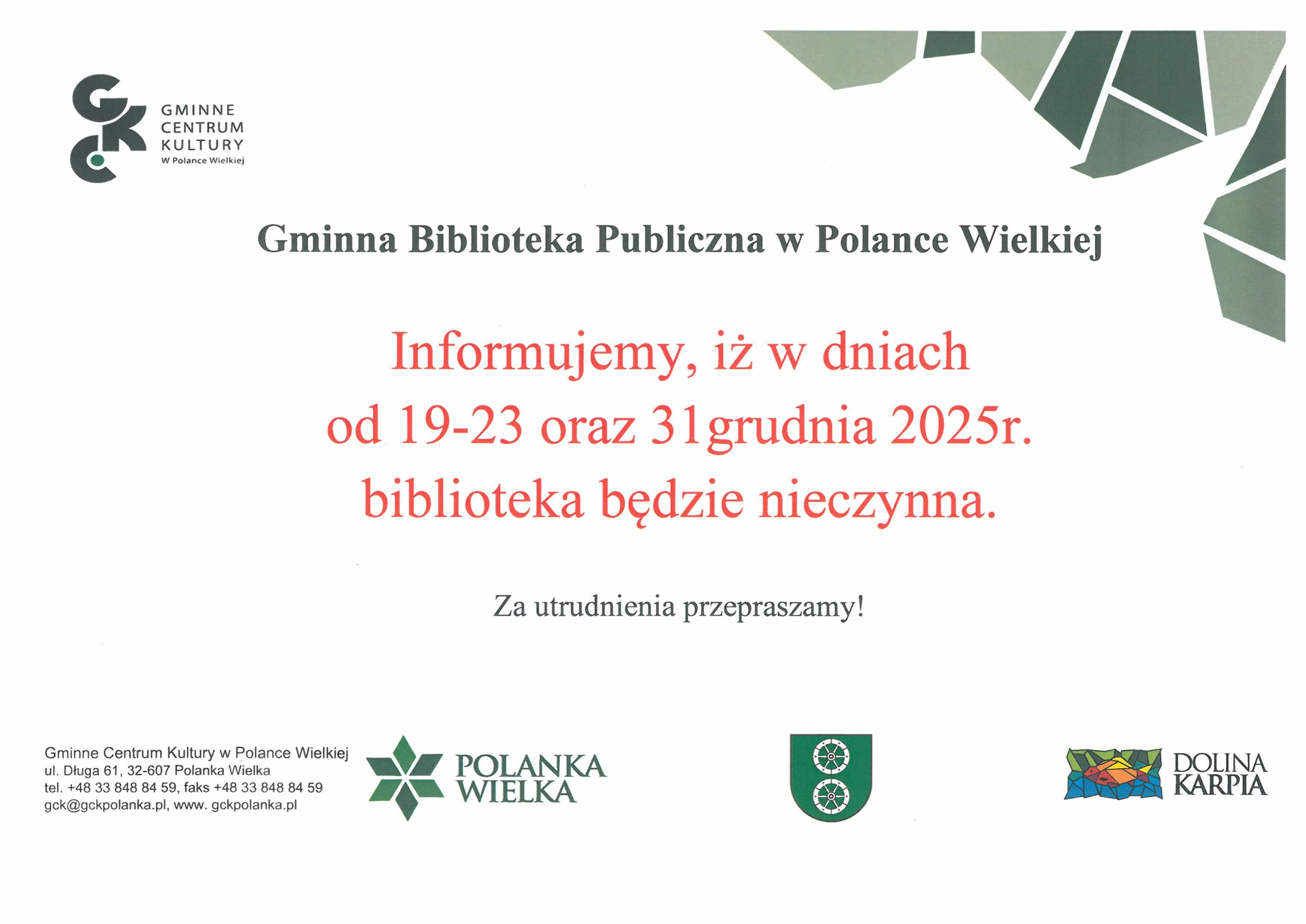W dniach od 19-23 grudnia oraz 31 grudnia 2025r. biblioteka będzie nieczynna!!! Za utrudnienia przepraszamy! View Larger Image 8 grudnia 2025|Biblioteka| Podobne wpisy Warsztaty twórcze w bibliotece – tworzymy papierowe ozdoby choinkowe! 2 grudnia 2025 Zabawa w chowanego z Misiem Tulisiem!!! Przygody w bibliotece!!! 28 listopada 2025 Przedszkolaki w bibliotece!!! 26 listopada 2025 Warsztaty w bibliotece!!! Świąteczne pieczenie pierników!!! Druga tura. Ruszyły zapisy!!! 26 listopada 2025 “Wszystko czego szukasz, znajdziesz w bibliotece” Michiko Aoyama 19 listopada 2025 “Piąte dziecko” Doris Leesing w Dyskusyjnym Klubie książki 30 października 2025