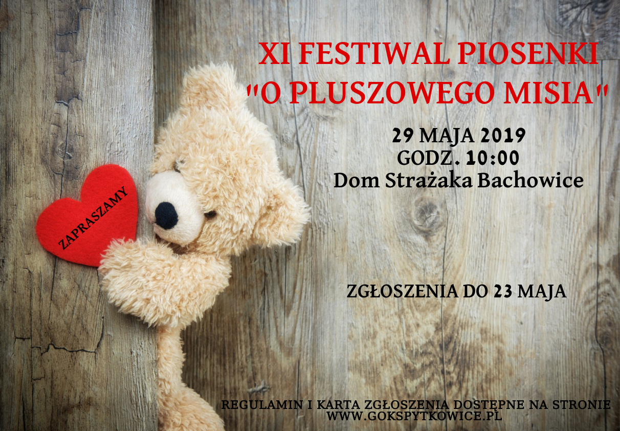 Gminny Ośrodek Kultury w Spytkowicach serdecznie zaprasza dzieci do wzięcia udziału w XI Dziecięcym Festiwalu Piosenki „O Pluszowego Misia”. Festiwal odbędzie się 29 maja 2019r. tj. środa, o godz. 10.00 w Domu Strażaka w Bachowicach. Konkurs ma charakter otwarty i jest skierowany do dzieci z przedszkoli, klas „O” oraz klas I-III.